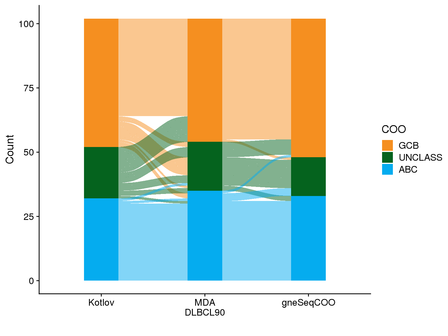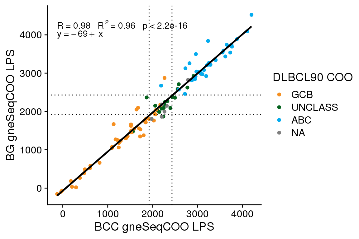 The frank misclassification rate (switching from ABC to GCB) is 1/75 (1.3%) when comparing gneSeqCOO (BG) to NanoString, or 0% when comparing gneSeqCOO (BCC) to NanoString or gneSeqCOO results run at BG vs at BCC.