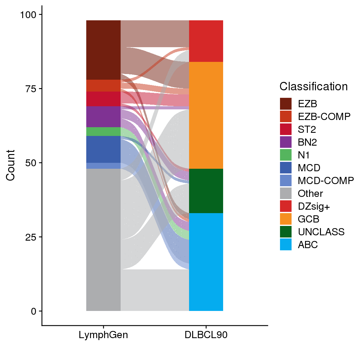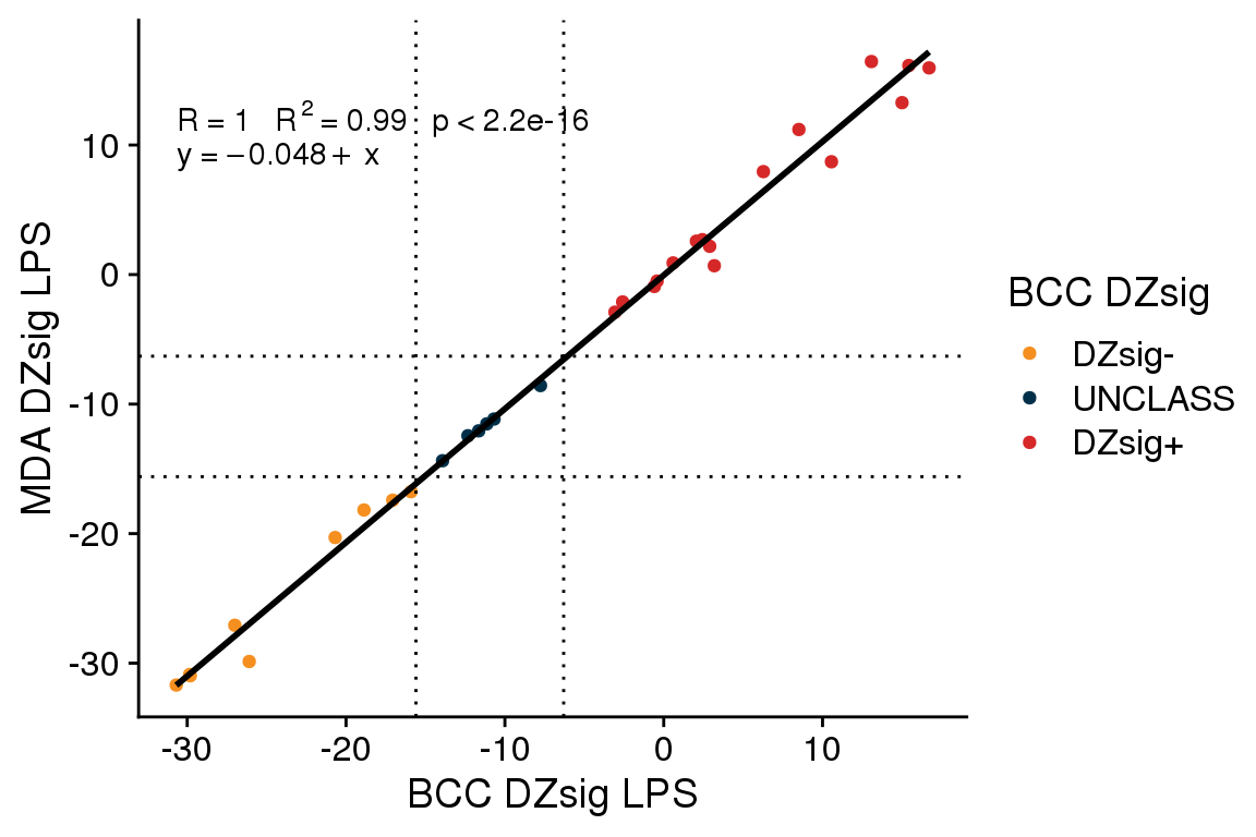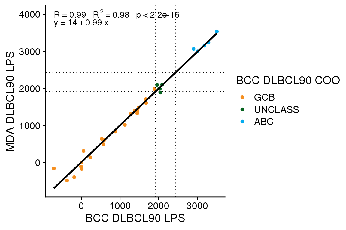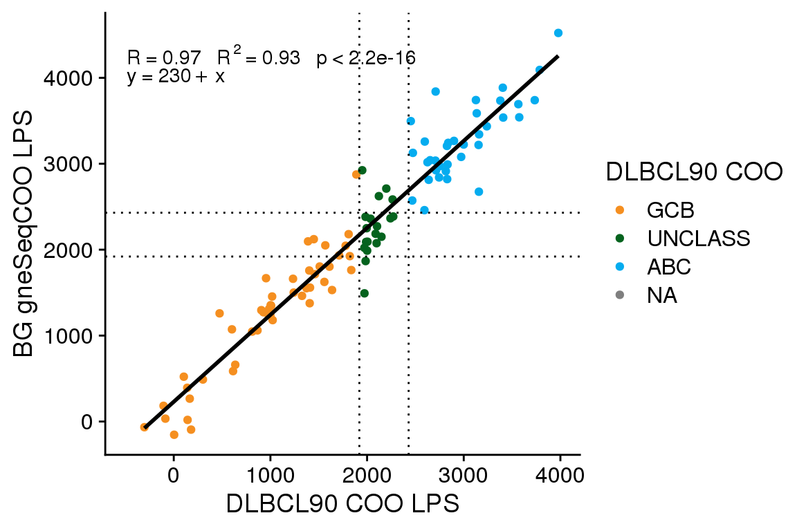 The accuracy of gneSeqDZsig among validation cohort tumors classified as ABC or UNCLASS by the DLBCL90 COO assay is 1 (95% CI 0.96 - 1). There were no frank misclassifications (i.e. switching from DZsig+ to DZsig- or vice versa) when comparing the gneSeqDZsig results to the NanoString results.