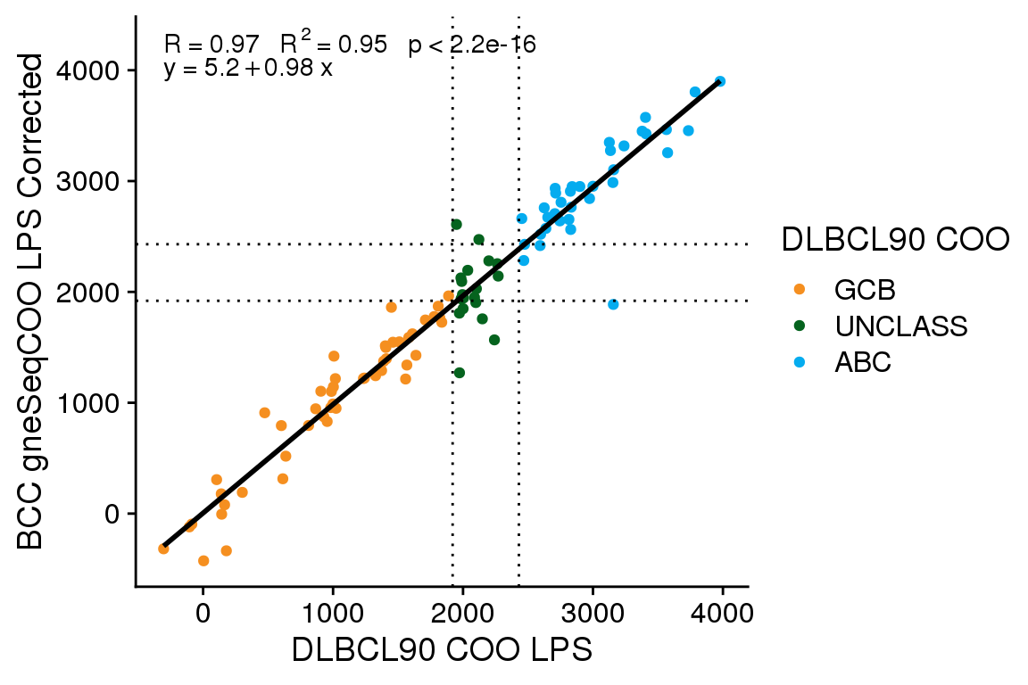 The gneSeqCOO LPS scores generated at BCC have a line of best fit with an intercept of 310 and a slope of 0.98. This is similar to the score shift observed for FFPE Ribodepletion samples from GAMBL, whereas fresh frozen samples have a smaller score shift (intercept of ~170-190). Here I will apply the same score shift correction determined from GAMBL (300) to see if this adequately corrects the score shift.