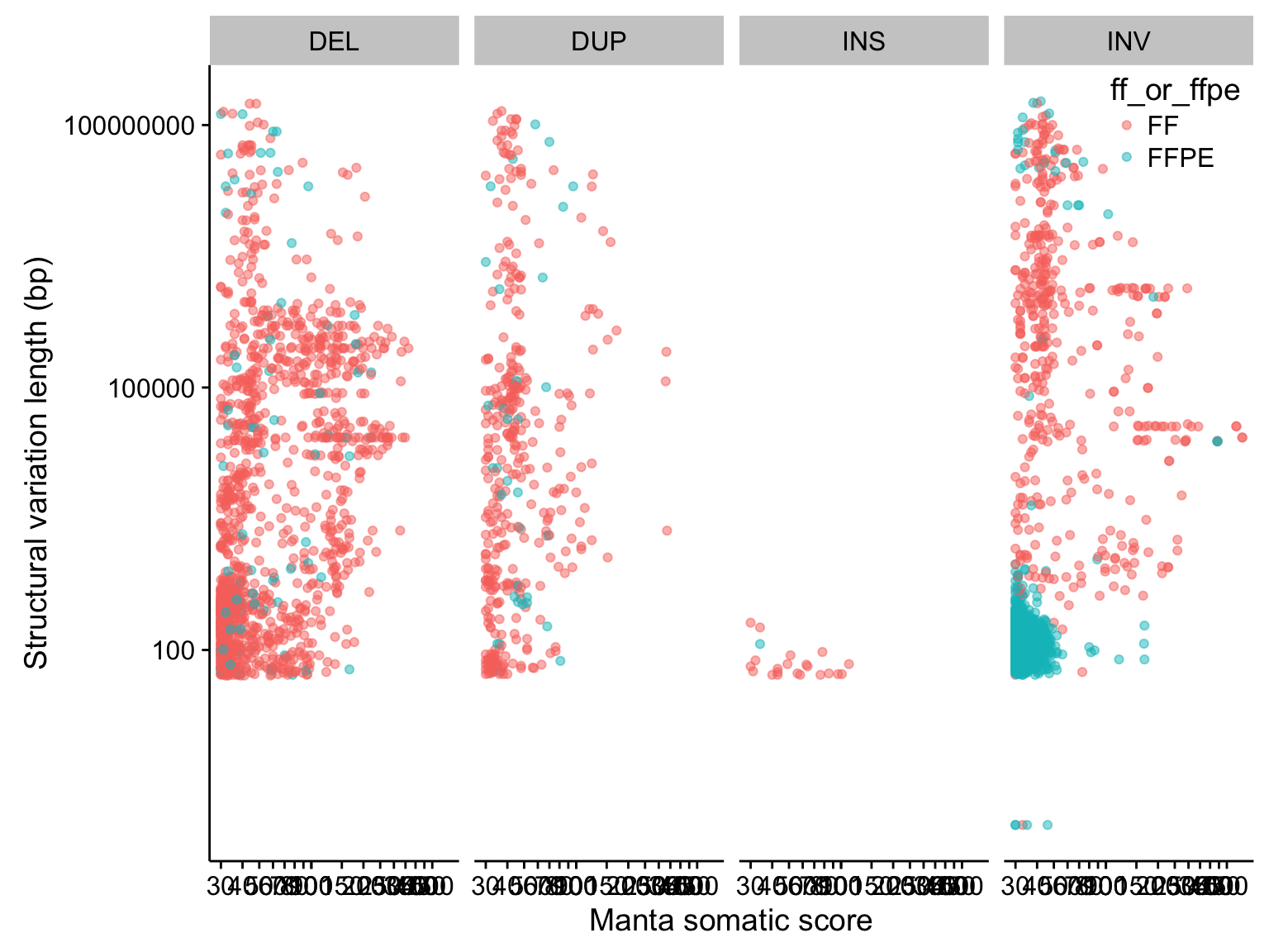 labs(x = "Manta somatic score", y = "Structural variation length (bp)")