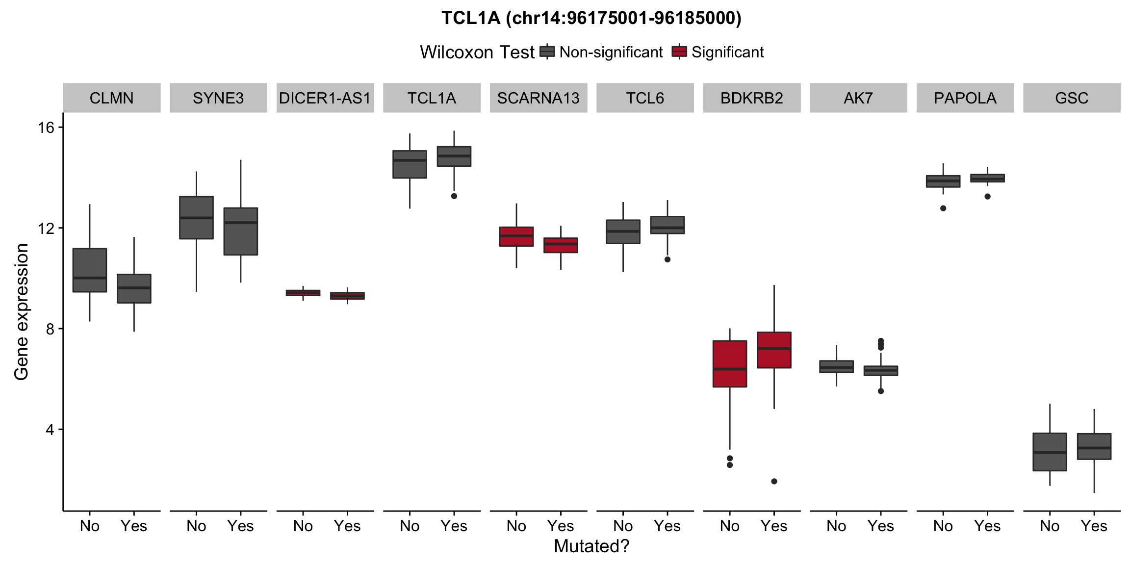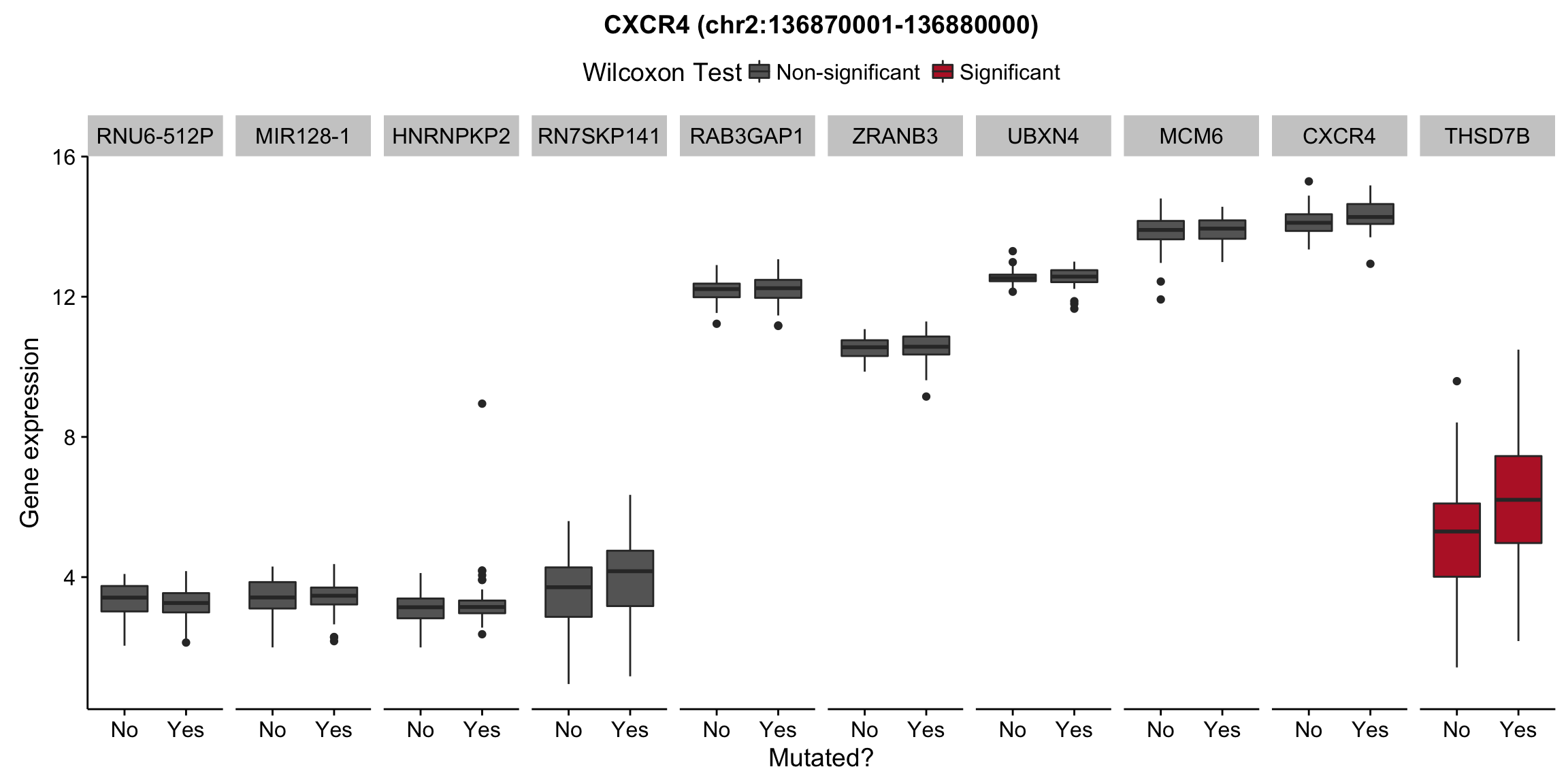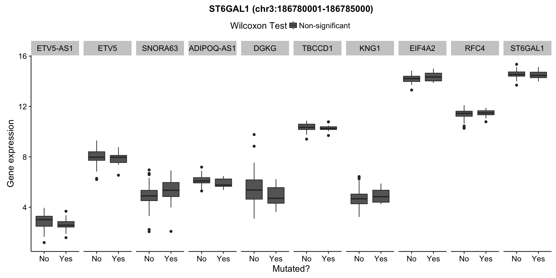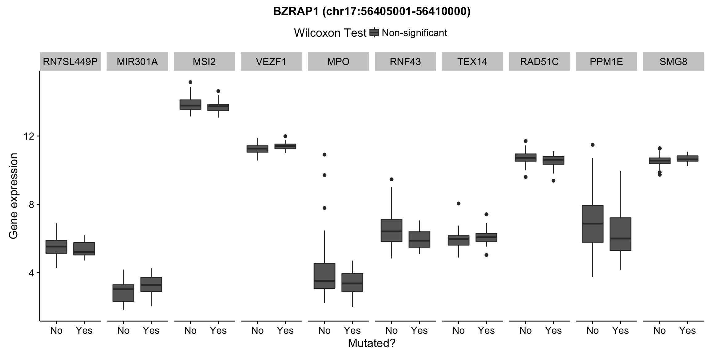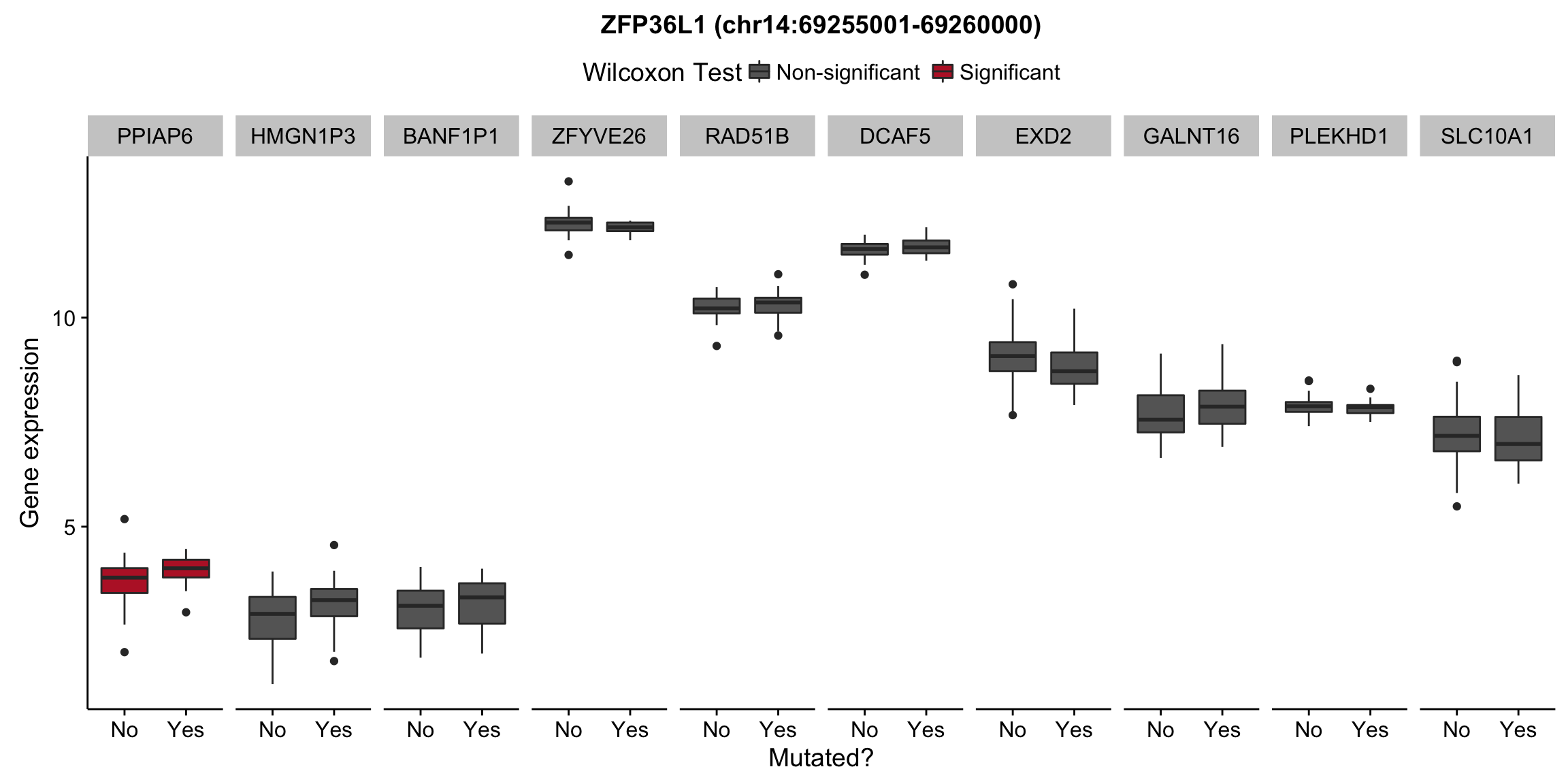 plot_gene_expr_near_mutations(assay(salmon$clean$cvst), genes_gr, hit, maf_grl)