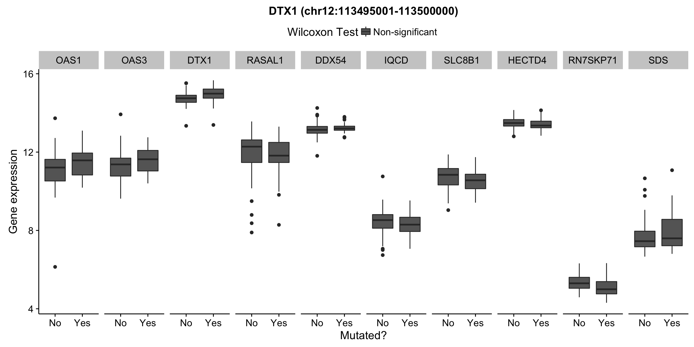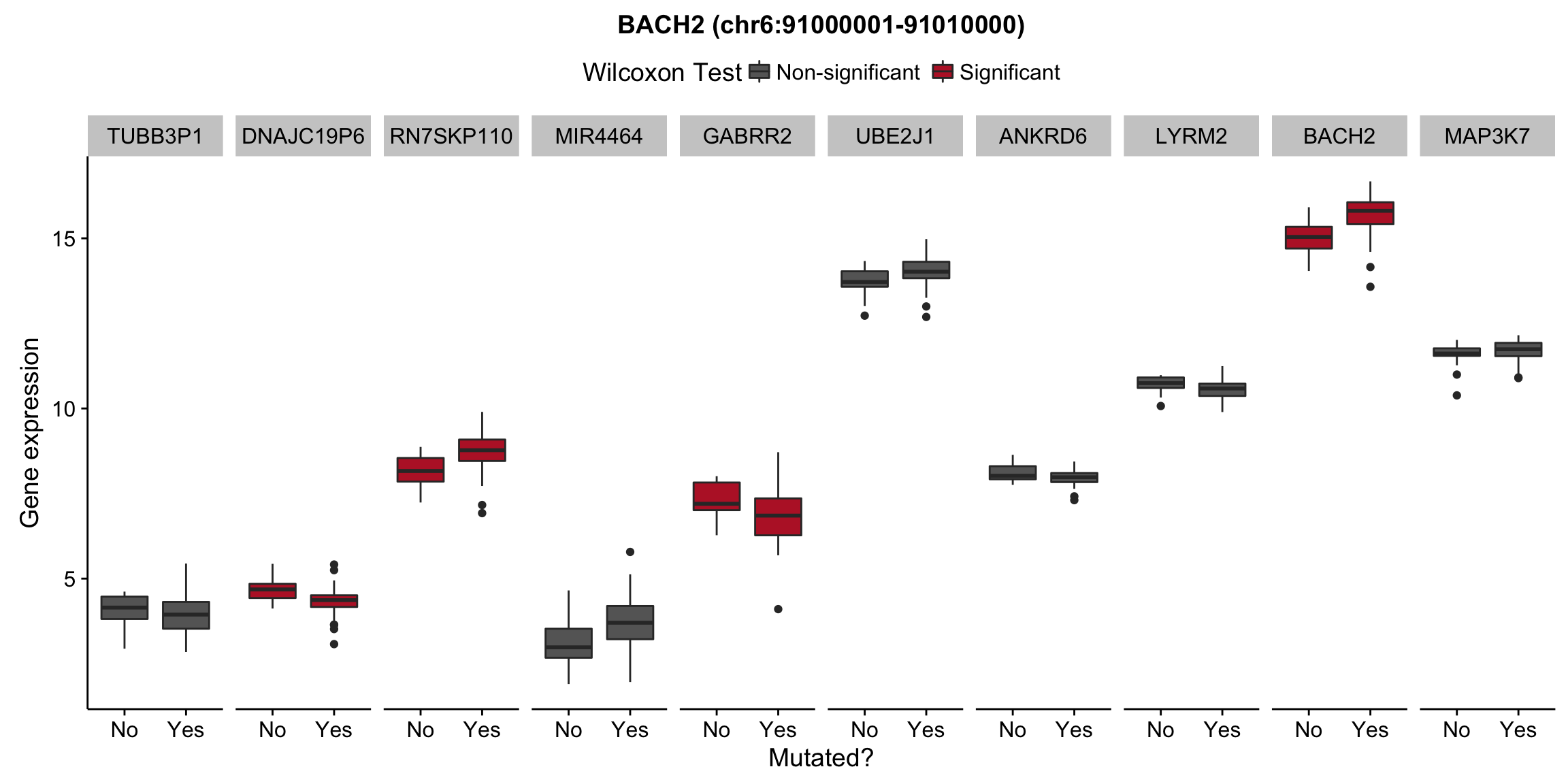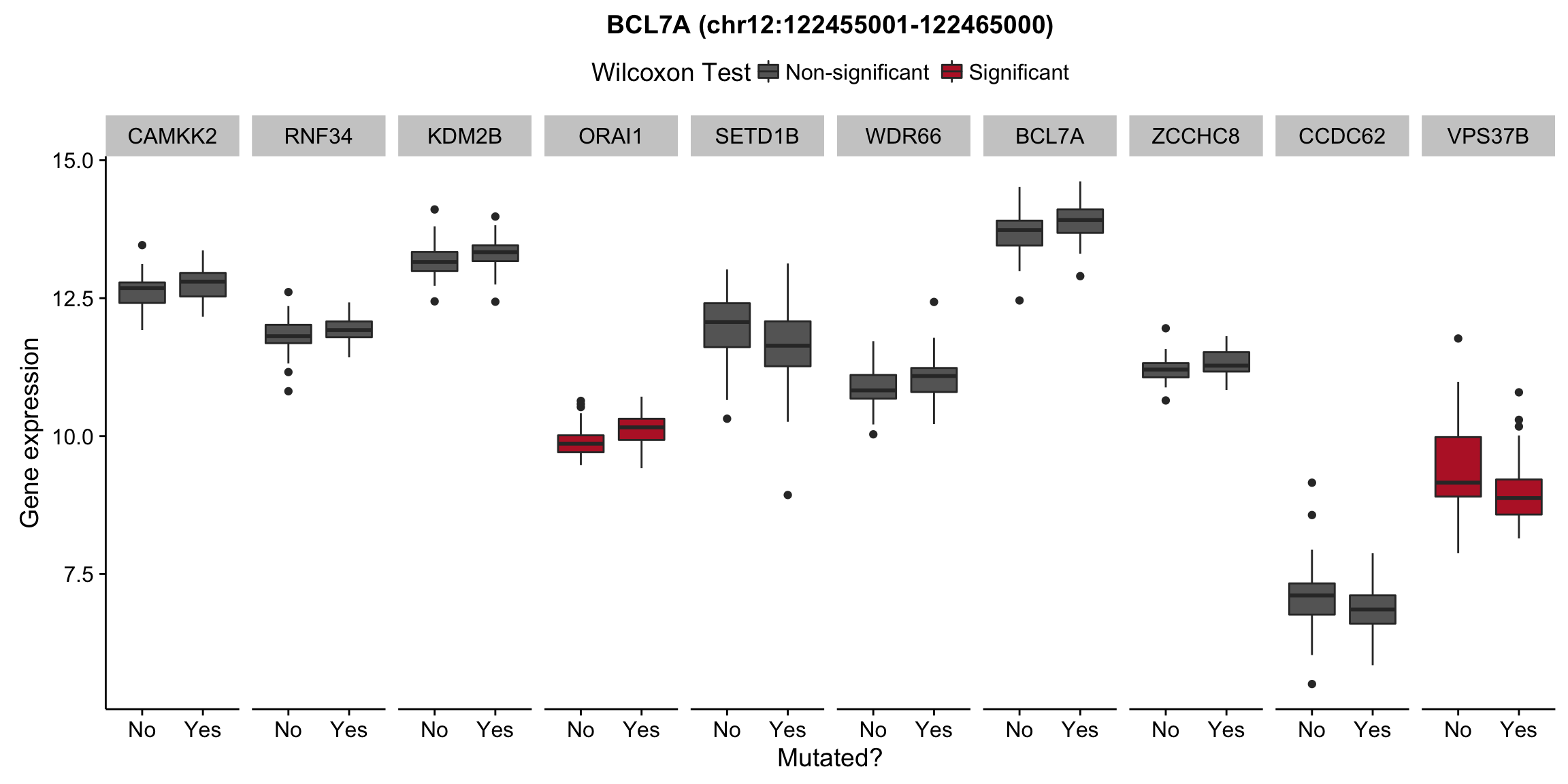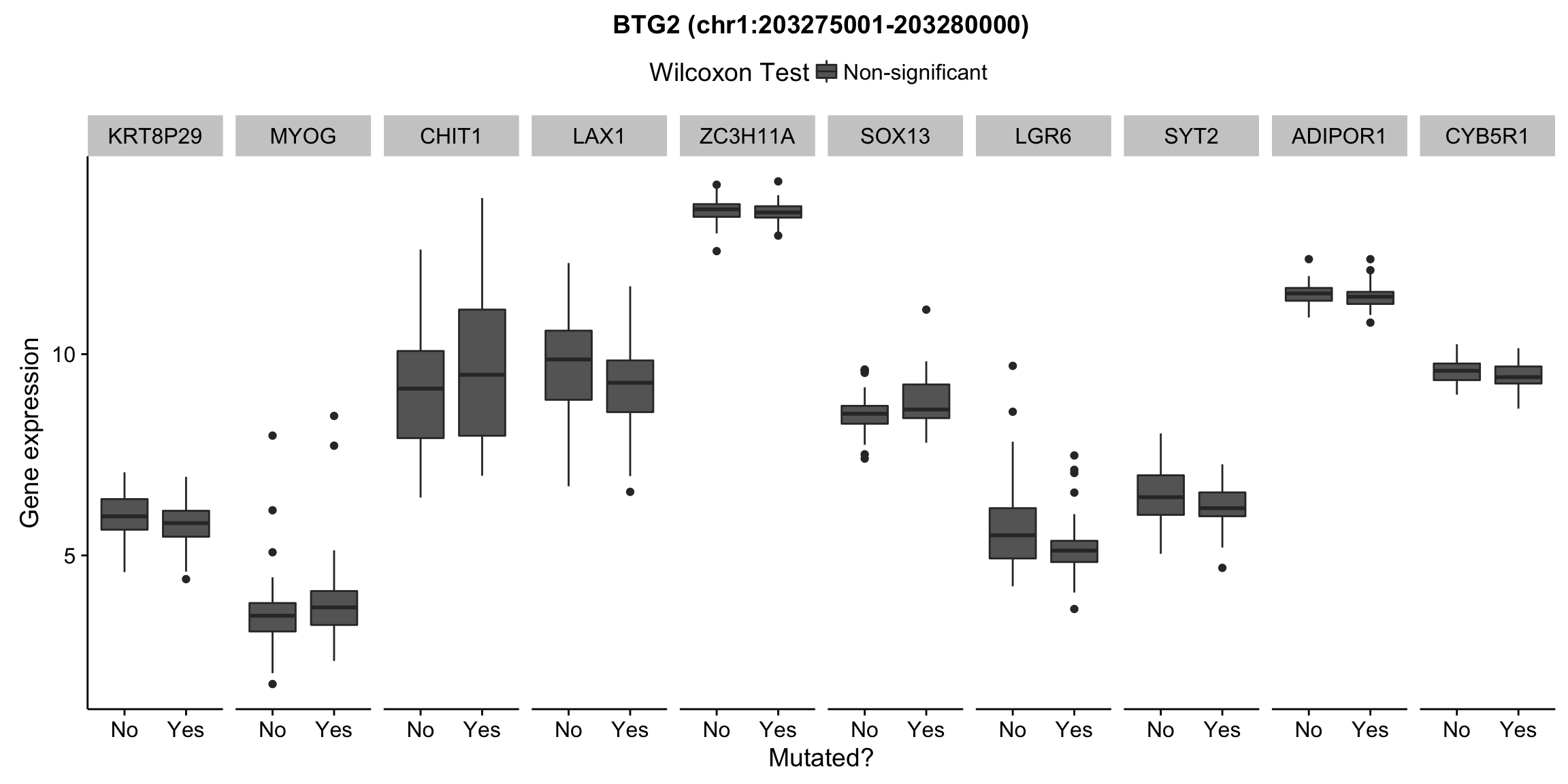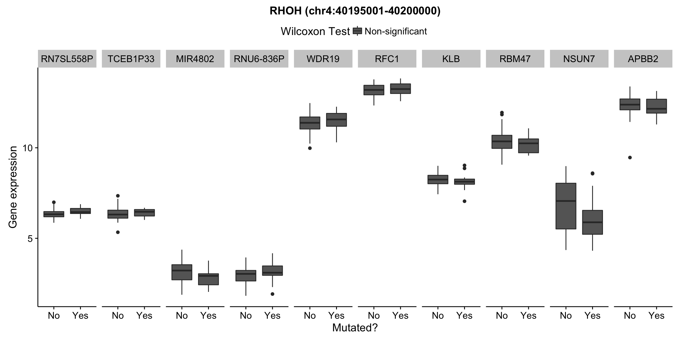 plot_gene_expr_near_mutations(assay(salmon$clean$cvst), genes_gr, hit, maf_grl)