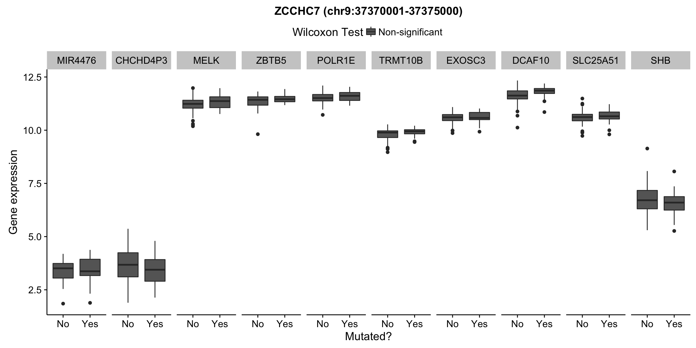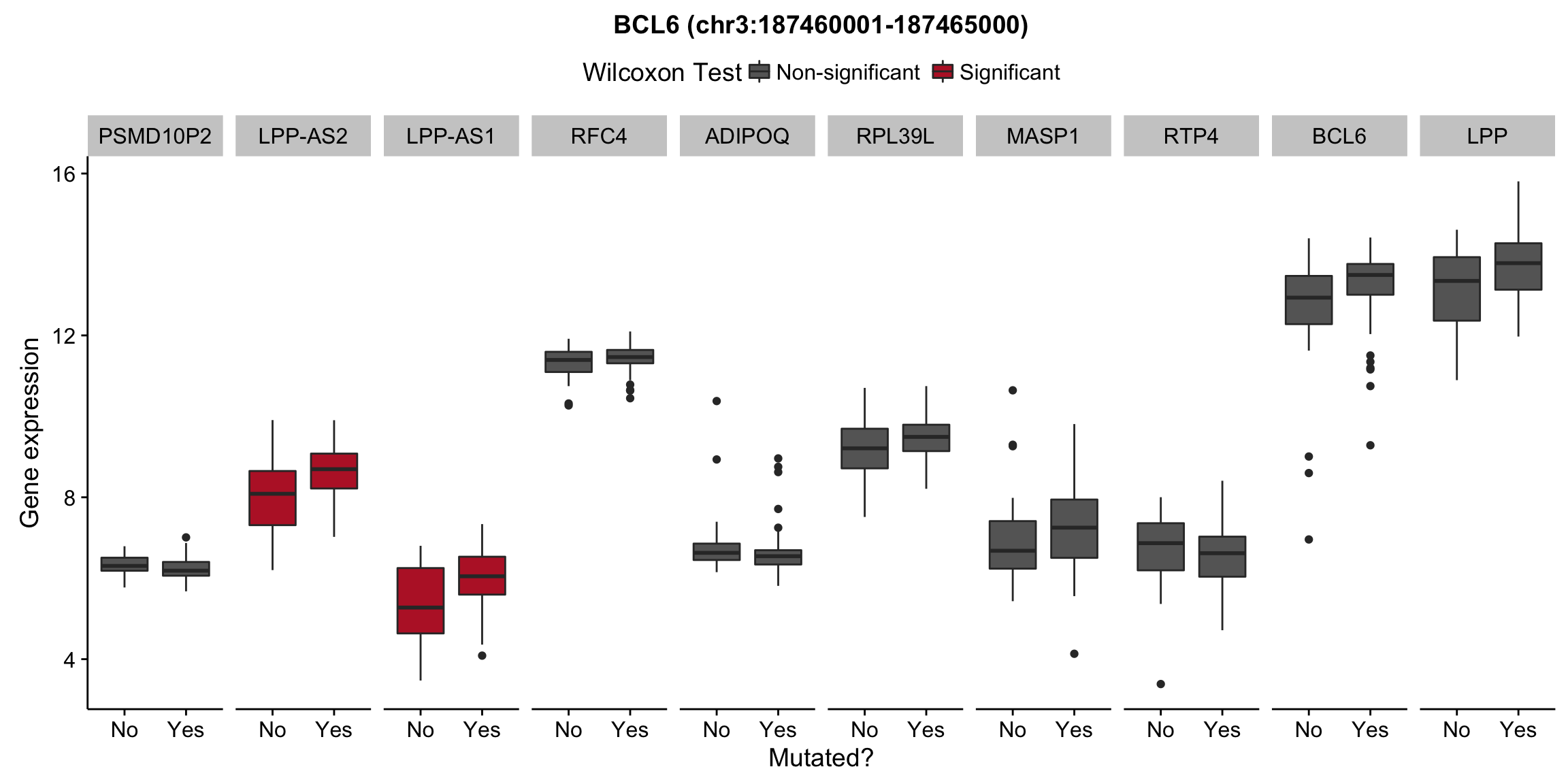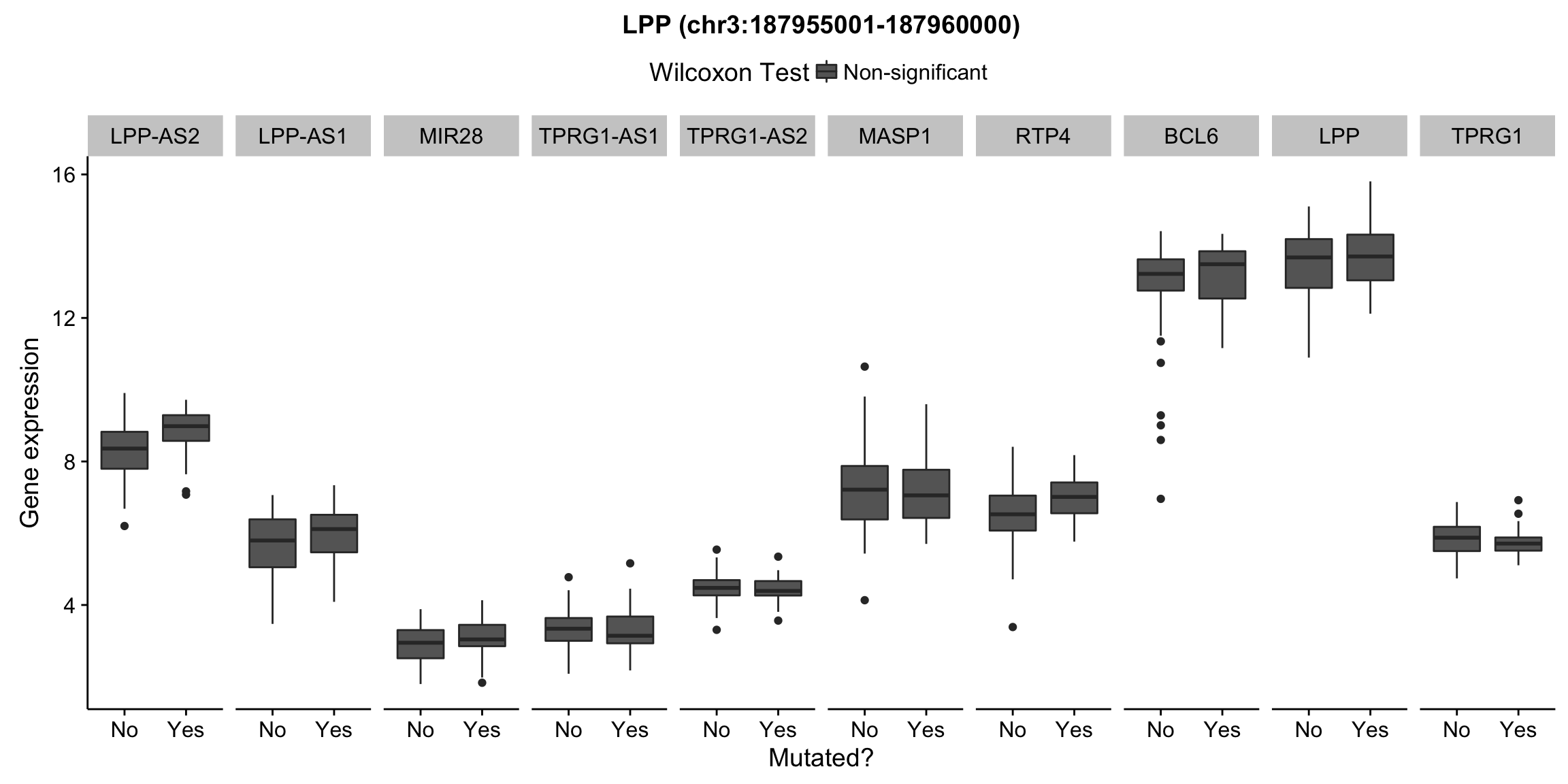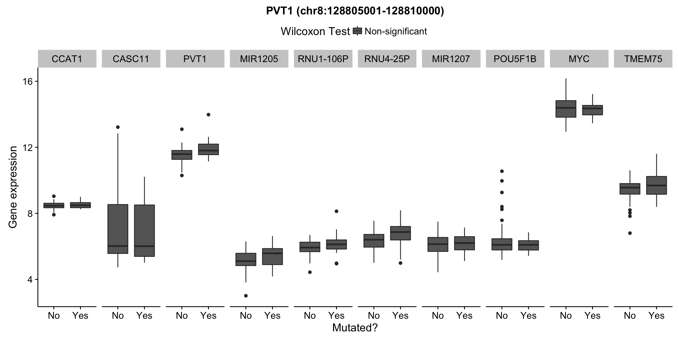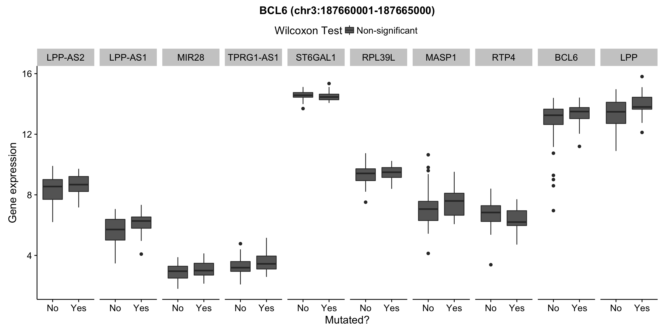 plot_gene_expr_near_mutations(assay(salmon$clean$cvst), genes_gr, hit, maf_grl)