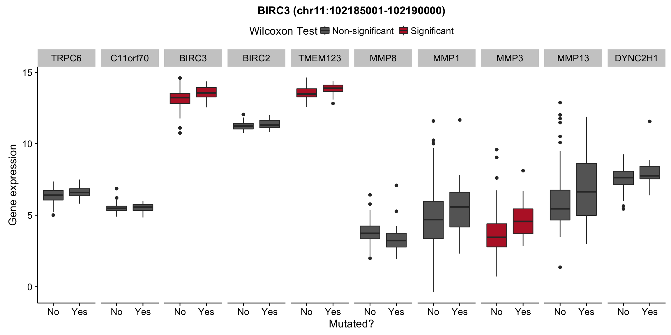 labs(x = "Mutated?", y = "Gene expression", fill = "Wilcoxon Test")