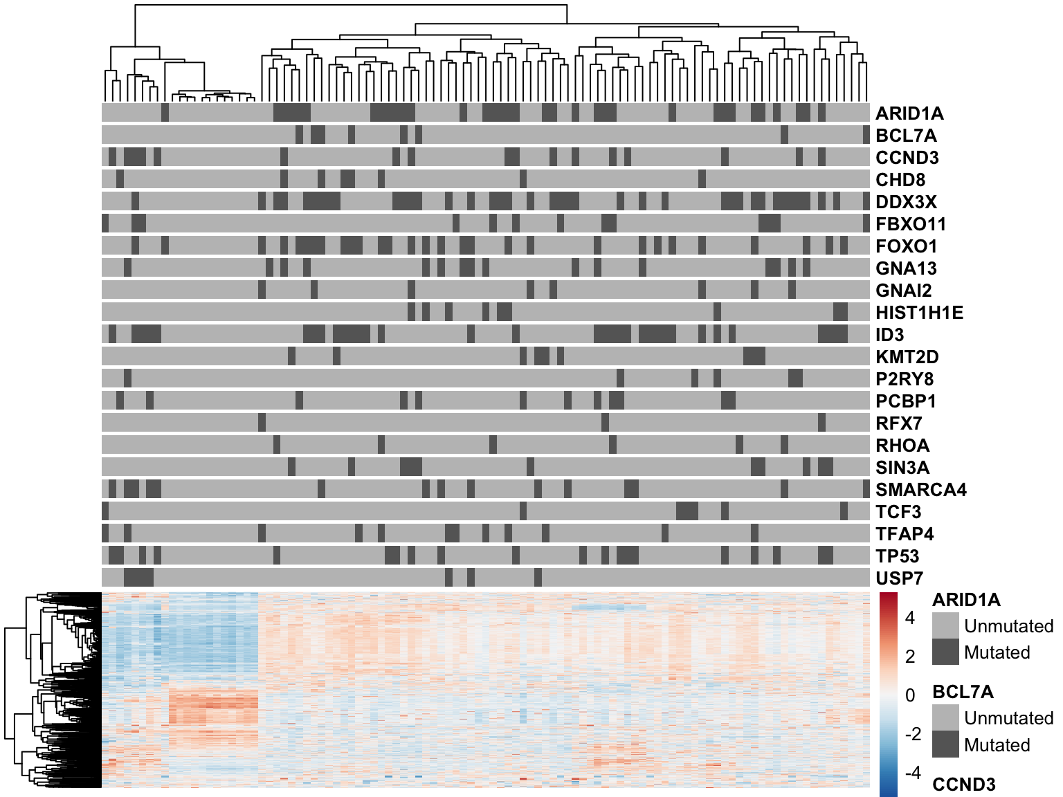 plot_heatmap(assay(most_var(salmon$clean$cvst, ntop)), mut_colours, metadata = mut_status)